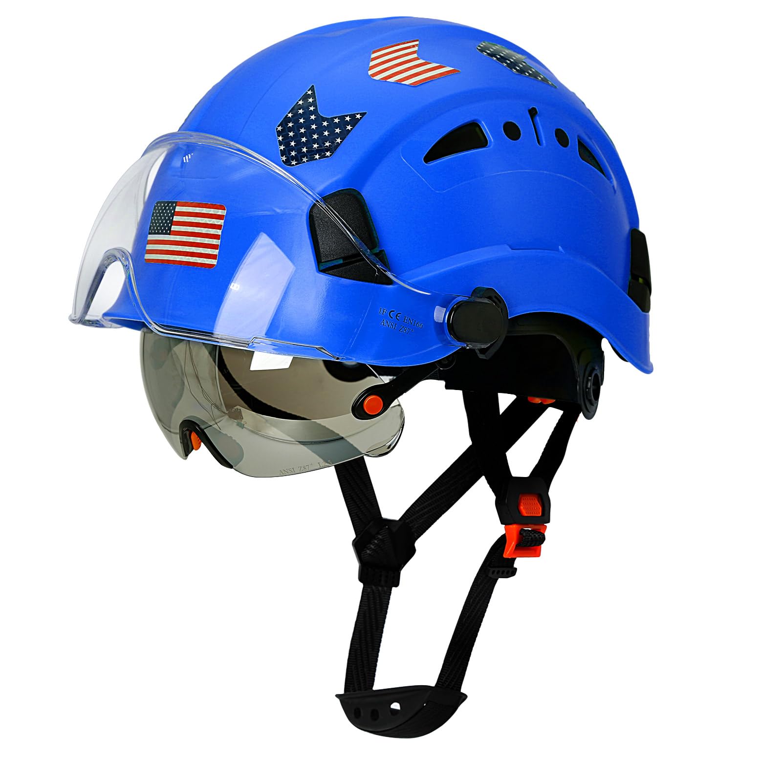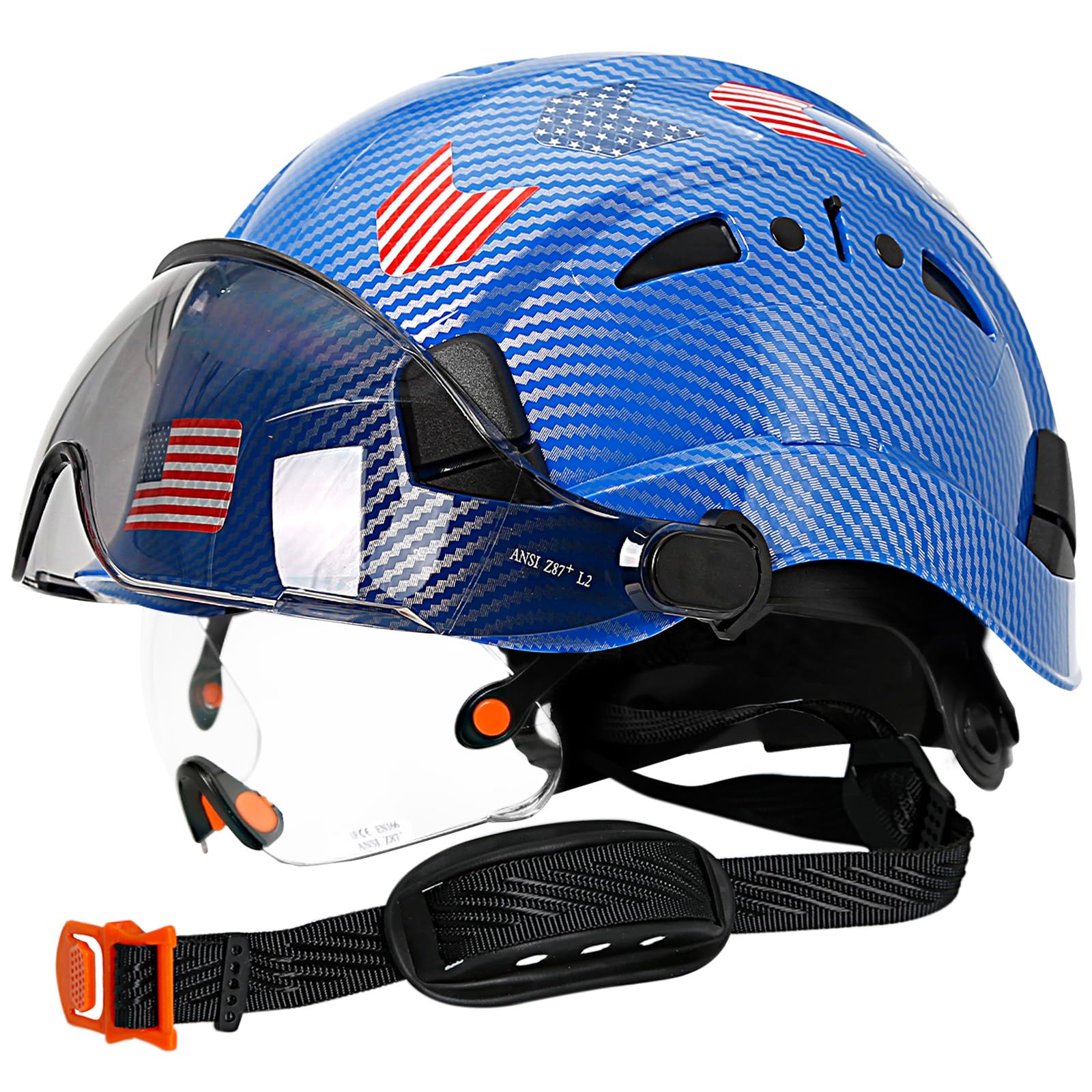 - The Construction Hard Hat provides great head and eye safety protection . Dual-layer hard hat visor, the outer clear visor to protect against splashes and other hazards, the inner anti-uv tinted visor . The safety helmet is made of high-impact ABS materials, meets OSHA standards. It features adjustable vents, a Rapid-Dial ratcheting headgear, a 6-point suspension system and the hard hat with chin straps, attachment slots for hard hat accessories, like full face shields ,earmuffs,light.